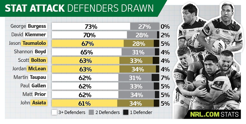 *Note: Now-retired Gold Coast Titans prop Brenton Lawrence also drew three-plus defenders with 62 per cent of his runs for Manly in 2017, (ranking equal seventh in the NRL).