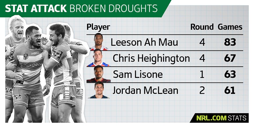 This weekend just gone saw Dragon Lesson Ah Mau (83 games) and Knights Chris Heighington (67 games) each bag their first try in years.