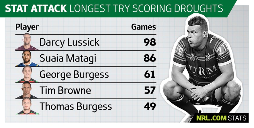 The two longest droughts heading into 2018 are still alive however; Manly prop Darcy Lussick (98 games) could be headed overseas this season to alleviate the club's salary cap crisis which would have the potential to rob him of a chance to break that duck (or to bring up his ton).