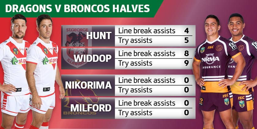 Widdop has eight line break assists and nine try assists in four Telstra Premiership games while Hunt has four line break assists and five try assists.