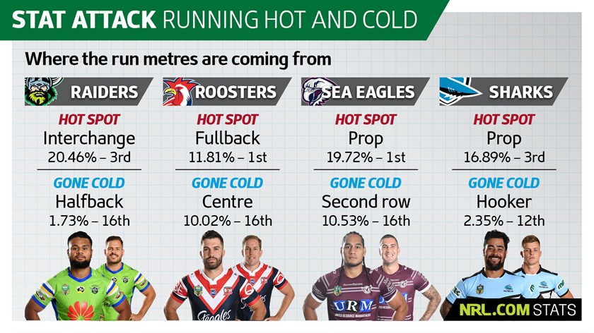 We always hear the words "run the ball!" with the playmakers and based on the opening 10 rounds of the season, halfbacks make up 3.79% of running metres. Six clubs have a higher average with Luke Brooks (6.56%) the most involved in churning out metres and boosted with some long-range tries in 2018. Canberra halves Sam Williams and Aidan Sezer (1.73%) are doing the least running in the NRL.