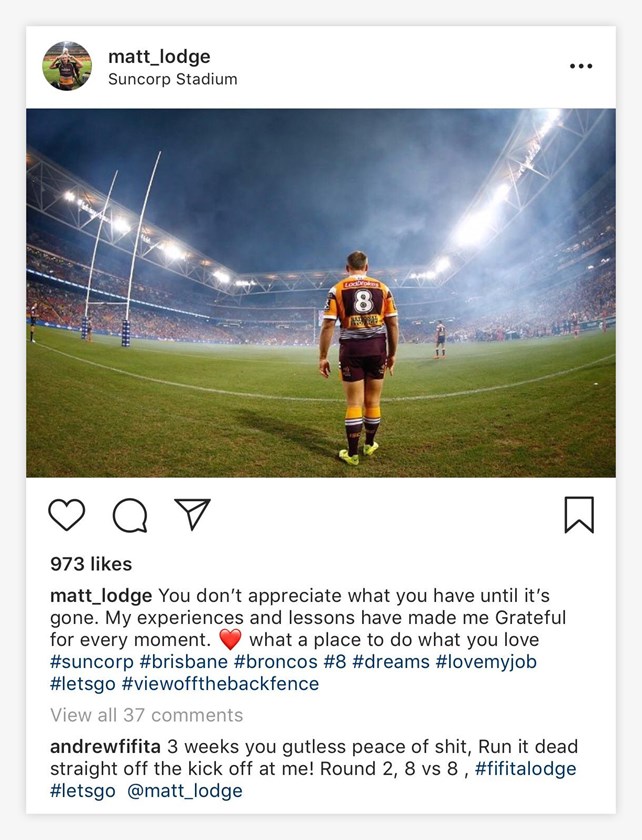 Lodge posted a photo of him waiting for a kick-off at Suncorp Stadium, to which Fifita replied: "3 weeks you gutless peace (sic) of sh--, Run it dead straight off the kick off at me! Round 2, 8 vs 8 #fifitalodge #letsgo."