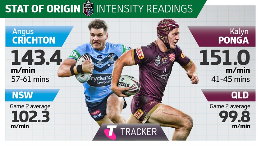 The 151.0 metres per minute produced by Ponga in the opening five minutes of the second half of Origin II was the single most intense five-minute period of any player at any point of this year's series.