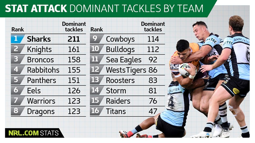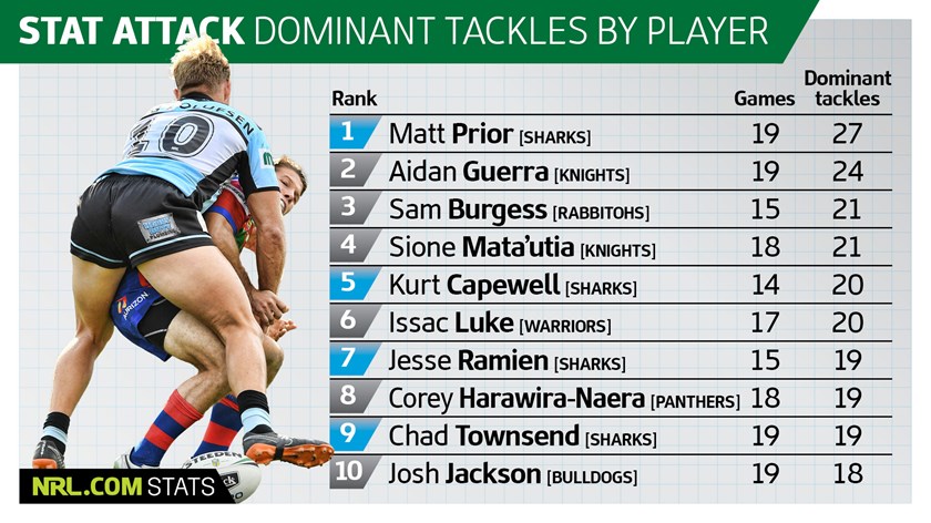 Six Sharks players are in the top 22 individuals for dominant tackles with Matt Prior (27) leading all comers, Kurt Capewell (20) a slightly surprising name in equal fifth, and edge defenders Jesse Ramien, Chad Townsend (both 19) and Matt Moylan (14) punching above their weight. Andrew Fifita (14) sits alongside Moylan in equal 17th.