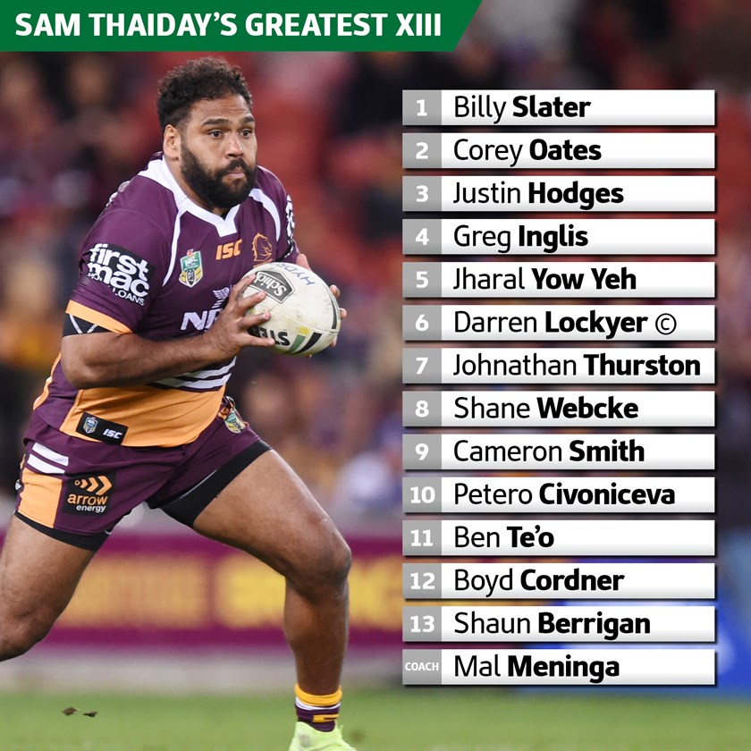 As the curtain draws on Sam Thaiday's career, the veteran Brisbane forward has revealed his greatest XIII and coach throughout his time in the game.