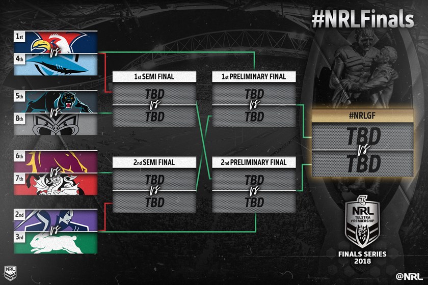 • Saturday, 7.50pm: Sydney Roosters (1) v Cronulla (4) at Allianz Stadium or Penrith (5) v Warriors (8)