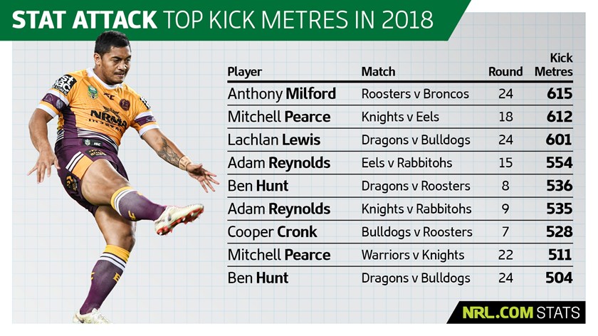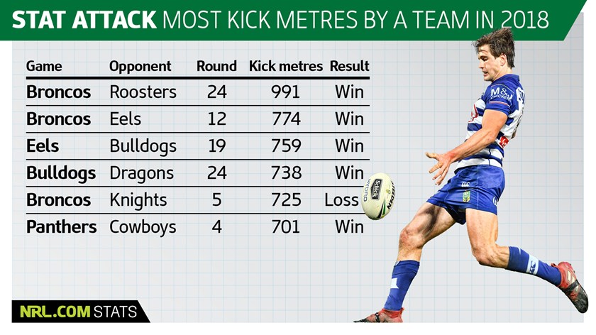 The incredible 991 metres booted by the Broncos against the Roosters last weekend was the first time this year a team had even kicked 800 metres. Kodi Nikorima also booted a personal season-high 256 metres.