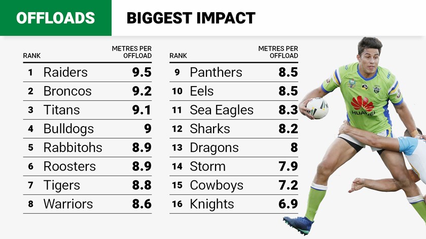 Cronulla meanwhile ranked second in offloads on the way to the 2016 title, and have ranked in the top five in the league in each of the past five seasons. The Dragons are another of the NRL's most prolific offloaders, ranking in the NRL top five for the past three years.