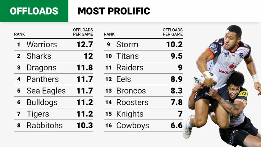 - After a 2017 season in which they put the offloads away and focused on completion rates – leading the league in that stat but still missing the finals – the Warriors turned back the clock and threw more offloads than any other team in 2018. They weren't the most effective in the competition, ranking in the middle of the league for metres per offload, offload effectiveness and support runs, but the change in attitude coincided with an improved attack and a return to the top eight.