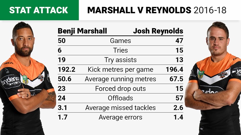 With the prized Wests Tigers No.6 jersey up for grabs, you would think Josh Reynolds and Benji Marshall would be at each other's throats. Far from it.