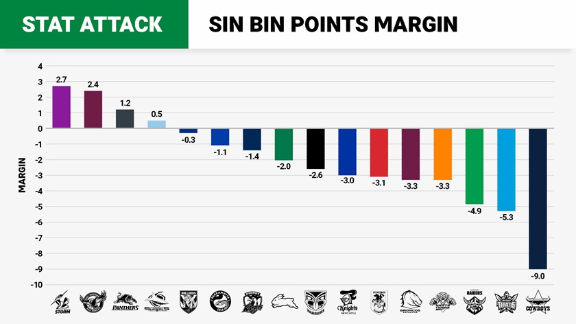 For the most part Manly managed to avoid losing a man to the bin in a season where it was used more than ever before, with just seven 10-minute spells handed out to the Sea Eagles last year. It didn't exactly hurt when they did though, Manly's 2.4-point positive swing while reduced to 12 was second only to Melbourne's +2.7.