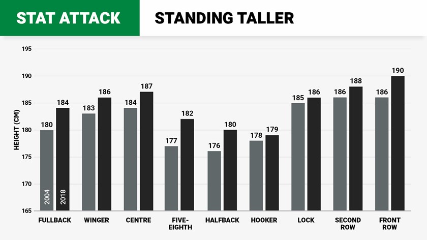 A look back at average player heights and weights by position from 2004 reveals that front rowers and fullbacks in the modern game are far bigger than just 14 years ago, while the average hooker has nearly identical metrics.