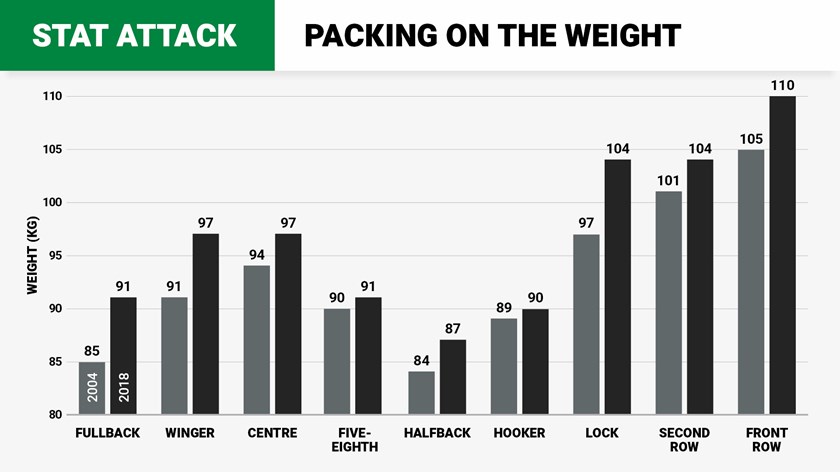 In the modern game a fullback on average is 91kg while a No.13 has bulked up to 104kg.