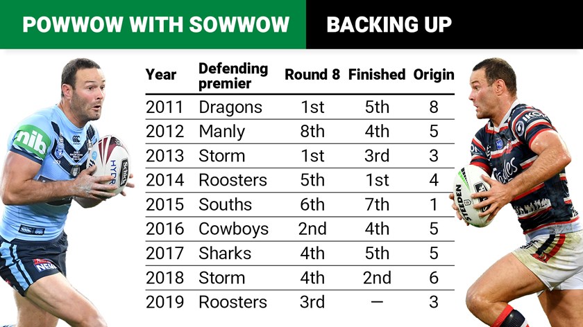 Eight is the most Origin reps defending premiers have had to supply since the Storm had 10 players involved in 2008, while the 2001 Broncos hold the record with a massive 13 (including two Blues as well as 11 for Queensland).