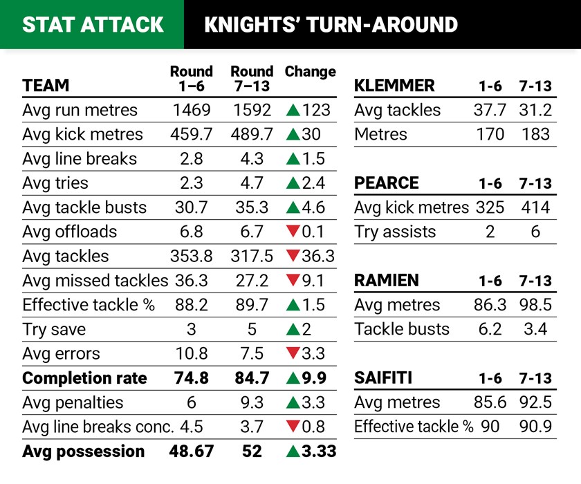 Interestingly the one stat that appears to have gone the other way is penalties conceded; the Knights were getting pinged six times per game through six rounds but that has jumped to over nine per game since.