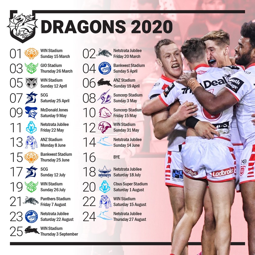 The Dragons will enjoy home games against Wests Tigers and the Panthers to begin the season before making the daunting trip to Canberra to face last seasons' grand finalists. A clash with Parramatta at Bankwest Stadium concludes the Red V's opening month.
