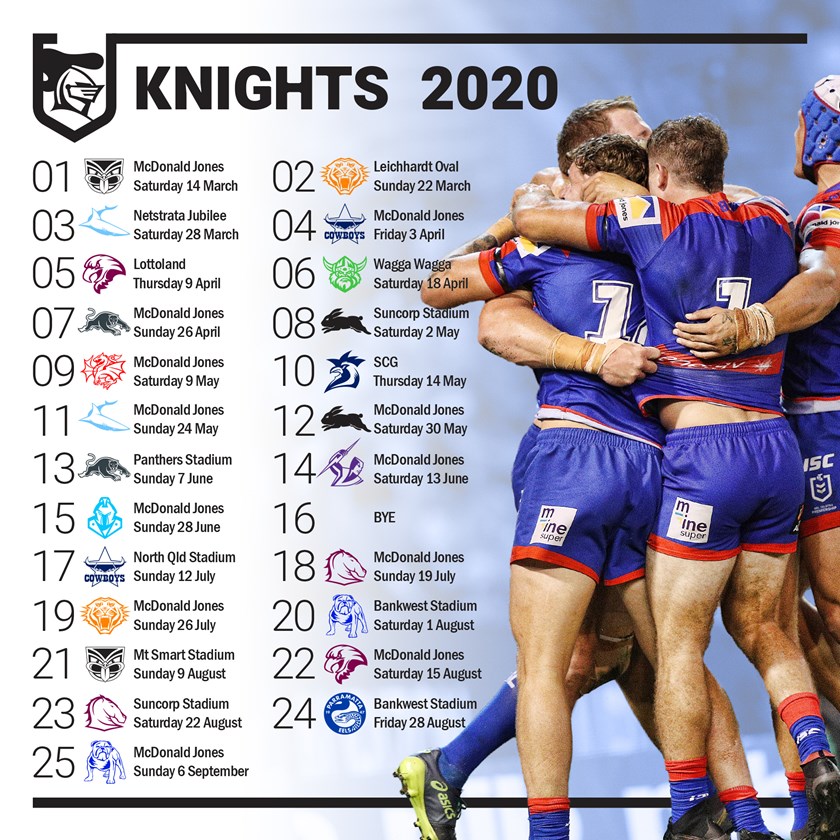 Last season the Knights had three home games in their opening four rounds, but only won one. Next year they'll be hoping for a better start as they host the Warriors and Cowboys, and travel to Sydney for the Wests Tigers and Sharks.