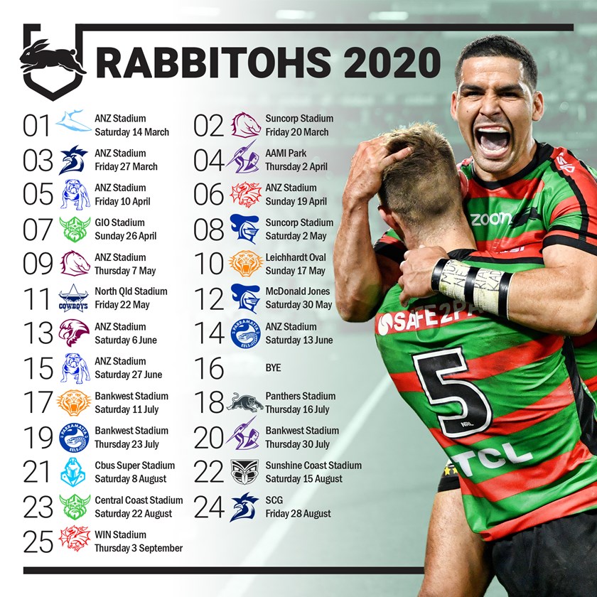 The Bunnies' final game at ANZ falls in round 15, in which they will be the away team against the Bulldogs. Their remaining four home games will be taken to Bankwest Stadium (two games), Sunshine Coast Stadium and Central Coast Stadium.