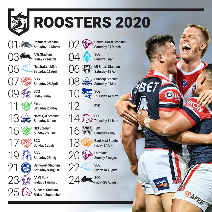 The Chooks make the road trip to Penrith to begin their quest for a three-peat, followed by a home game against Manly. Another chapter will be penned in the Book of Feuds when the Roosters play South Sydney in round three before hosting the Titans at the SCG – the scene of last season's massacre of the wooden spooners.