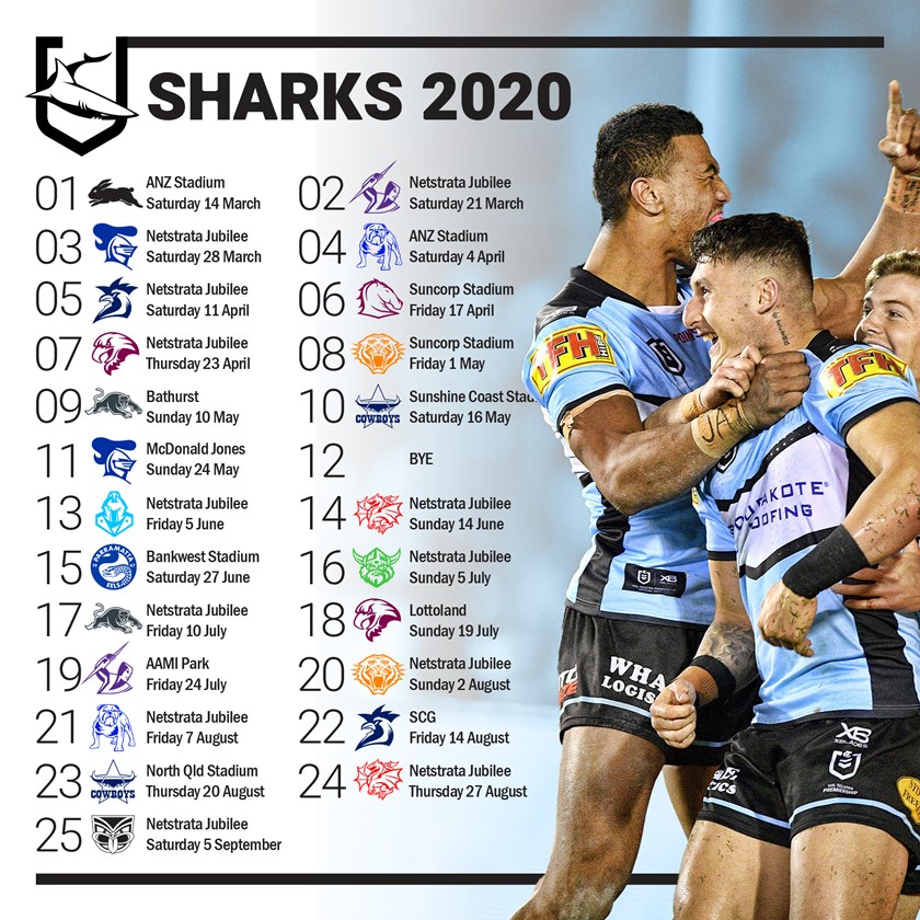 It's a big start for the Sharks, with their season opening against the Rabbitohs before regular sparring partners Melbourne are the first side hosted at their new digs in Kogarah. Newcastle and Canterbury round out their first month of 2020, with Cronulla enjoying four straight seven-day-turnarounds to start the year.