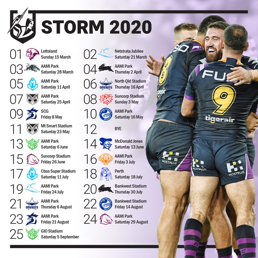 The Storm start the year against two of their most bitter rivals in the Sea Eagles and Sharks and both those games are in Sydney. But they round out their first month of football hosting the Panthers and Rabbitohs at AAMI Park. Craig Bellamy's men started the 2019 season 5-0 before losing to the Roosters by a point and it'll be interesting to see if they can set up their season by getting off to a flyer once again.