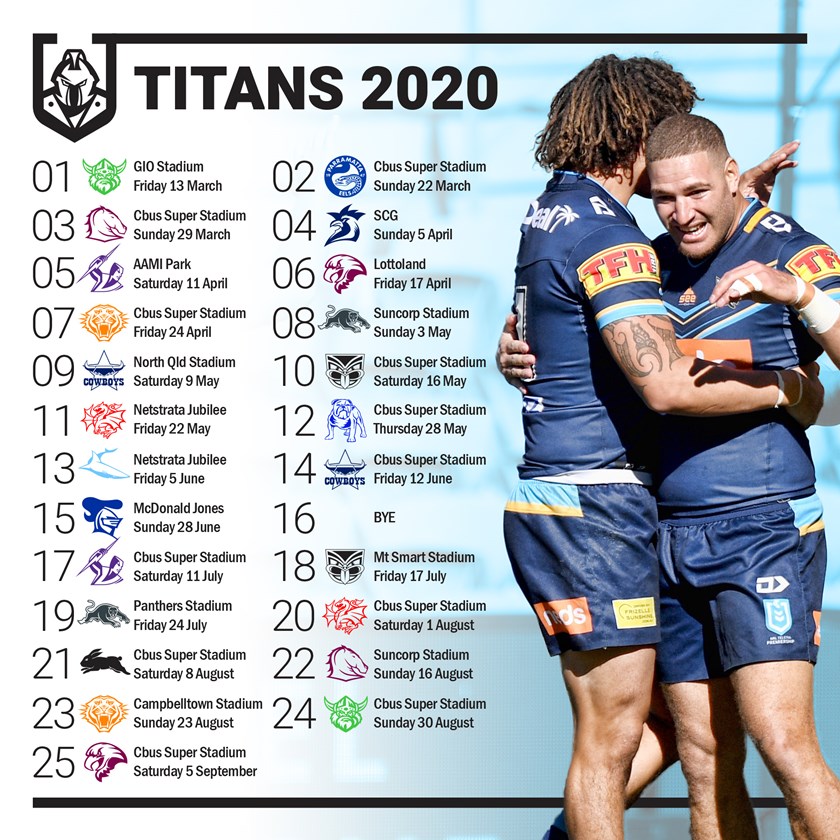Rounds 4-6. As mentioned above, facing the Raiders (R1), Roosters (R4) and Storm (R5) will certainly test the Titans resolve. But Round 6 against Manly means these three games are all 'away' at the SCG, AAMI Park and Lottoland. Then again, the Titans have breached the walls at 'The Fortress' in both 2018 and 2019.