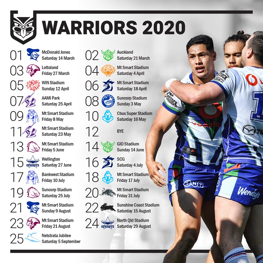 An away battle against Newcastle will get the ball rolling before the Warriors host grand finalists Canberra in round two. The Warriors' frequent flyer points will keep building as they head back across the ditch to take on Manly and then return home the following week to greet Wests Tigers.