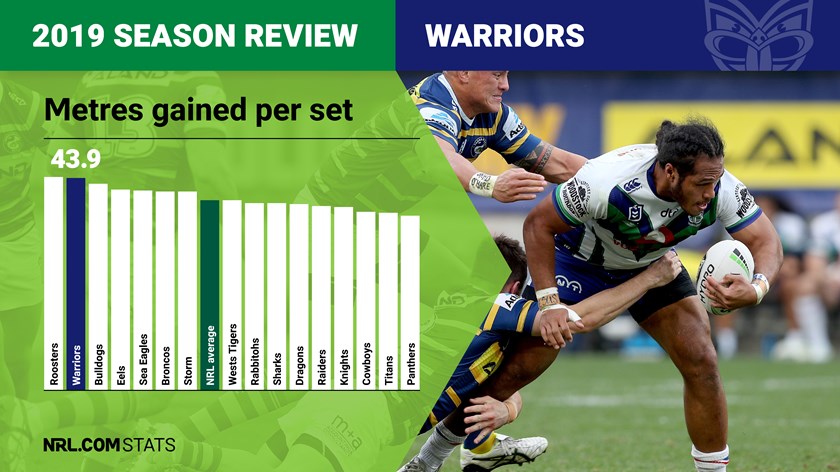 The Warriors were among the best at trucking it out of their end, with the likes of Tuivasa-Sheck and Maumalo making big metres on early plays and rugged ball-runners in the forwards like Ah Mau, Paasi and Afoa keeping the momentum going. All up the Warriors averaged 43.9 metres gained per set, fractionally trailing just premiers the Roosters (44.0 metres per set) with half the competition averaging below 42 metres per set. It may not sound like a big deal but with between 30 and 40 sets for each team per game, a two-metre advantage per set equates to virtually one free trip the length of the field.