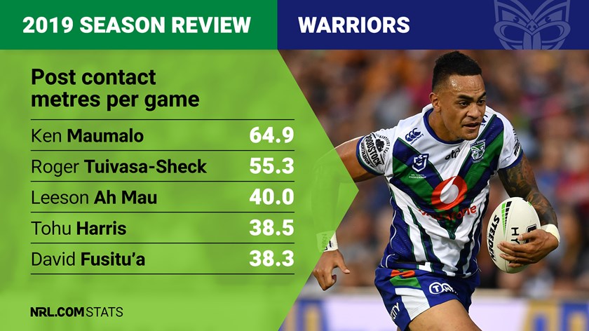 Post-contact metres – additional ground gained by a ball carrier after meeting the defence – are a precious commodity early in yardage set when every metre gained is like gold. On the flipside they are arguably counter-productive when your team is inside the attacking 40 and fast play-the-balls and ball movement is the order of the day. With that in mind, this is an area where the Warriors had some impact, with two of their back three making the top 10 right across the NRL. In a list headed by Broncos prop Payne Haas (72 metres per game), Warriors winger Ken Maumalo (65 metres per game) and fullback Roger Tuivasa-Sheck (55m PG) were consistently able to get yardage sets rolling early. On a per-carry basis, Maumalo (3.3, per run) was bettered by impact forwards Bunty Afoa (3.7m PR), Leeson Ah Mau and Ligi Sao (both 3.5m) with Afoa just scraping into the NRL top 10.