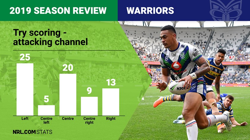 Easily the Warriors' most prolific route came on the far left flank, as Dally M winger of the year and the competition's third-top try-scorer Ken Maumalo racked up 17 four pointers playing outside Peta Hiku with the club crossing for 25 in total on the far left. Overall 42% of Warriors tries came on the left edge or centre-left channel compared to 31% on the right side. Only the Storm and Roosters scored more tries on the left wing, whereas the club doesn't figure in the top half of teams in any of the other four scoring channels.