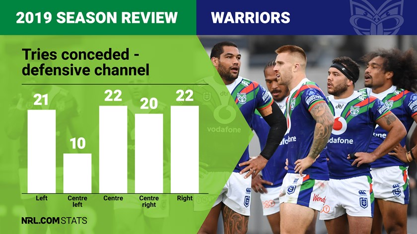 The Warriors leaked more points on the right than the left, with 44% of their 95 tries conceded in 2019 coming through the right or centre-right channels. Their 33 total tries through the centre-right channel was not just the worst in the NRL for that channel, but the worst in the NRL for any channel, ahead of the 28 leaked by Gold Coast through the centre-left. They were also worryingly flimsy through the middle, with 19 tries up the middle the fourth-worst tally in the NRL.