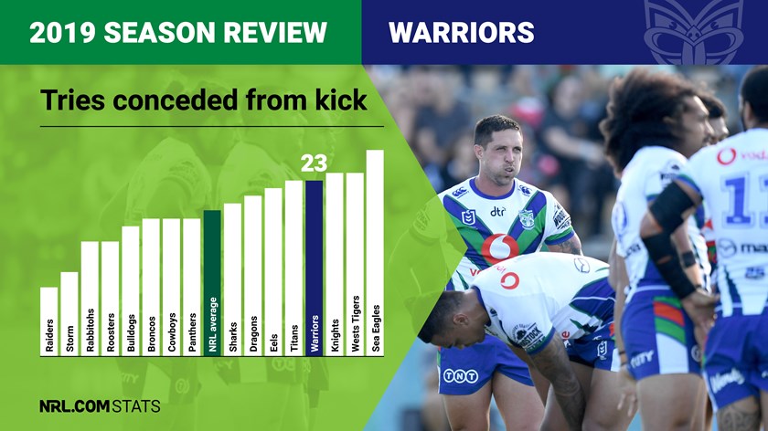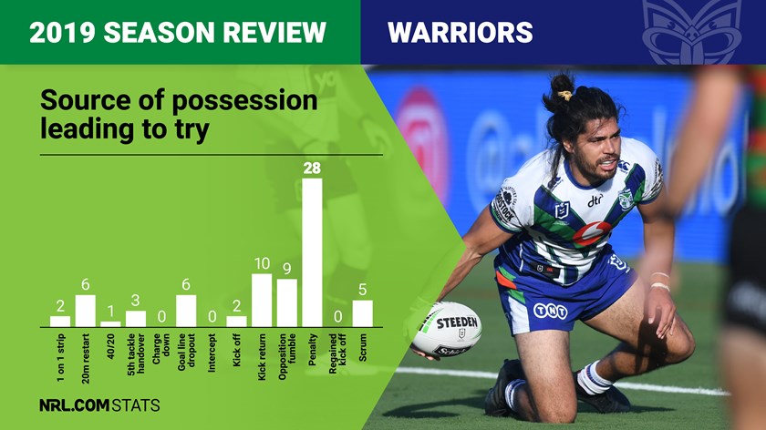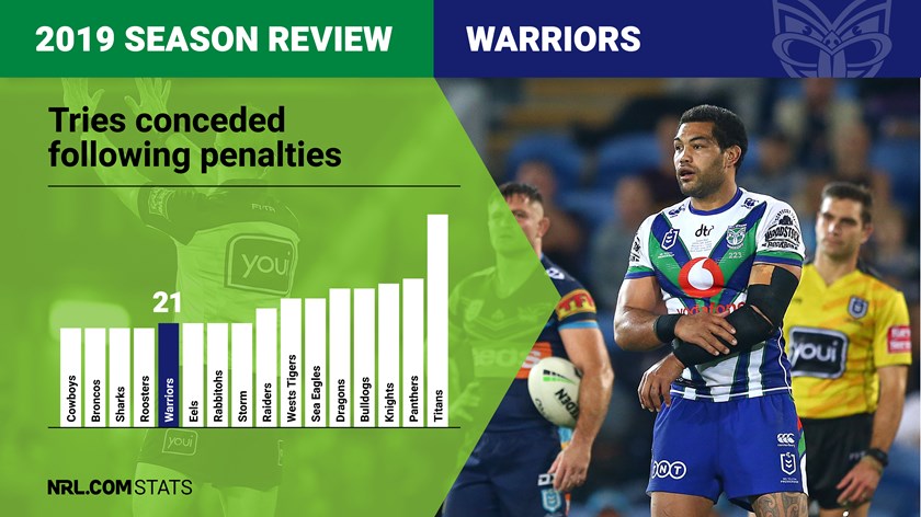 The Warriors may have had some defensive frailties in 2019 but they were among the best in the comp at defending penalties. Pinged 156 times through the season, the Warriors conceded just 21 tries from those infringements – only one more than the competition's fewest (the Cowboys, Broncos and Sharks all conceded 20 tries in the set after a penalty). With 21 of 95 tries conceded in the set after a penalty, the Warriors' tally of 22% of tries conceded coming from a penalty was the lowest in the NRL.
