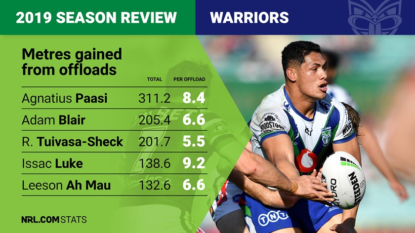 Offloads can be a double-edged sword, providing the unpredictable second-phase footy that can help break down the NRL's most efficient defensive structures while also hugely increasing the risk of losing possession. More offloads rarely equals more wins in simple black and white terms, with the Bunnies, Roosters and Storm throwing the fewest in 2019, while fifth-placed Parramatta threw the most. But it's a style that usually seems to gel well with the Warriors and their foray into no-offload no-risk footy in 2017 did not pay any dividends. In saying that the Warriors threw the fourth-most in 2019 with 286 total. Agnatius Paasi (37, 10th most in NRL) was the main contributor with 311 metres added from his offloads. Adam Blair and Tuivasa-Sheck's offloads each added more than 200 metres through the season.
