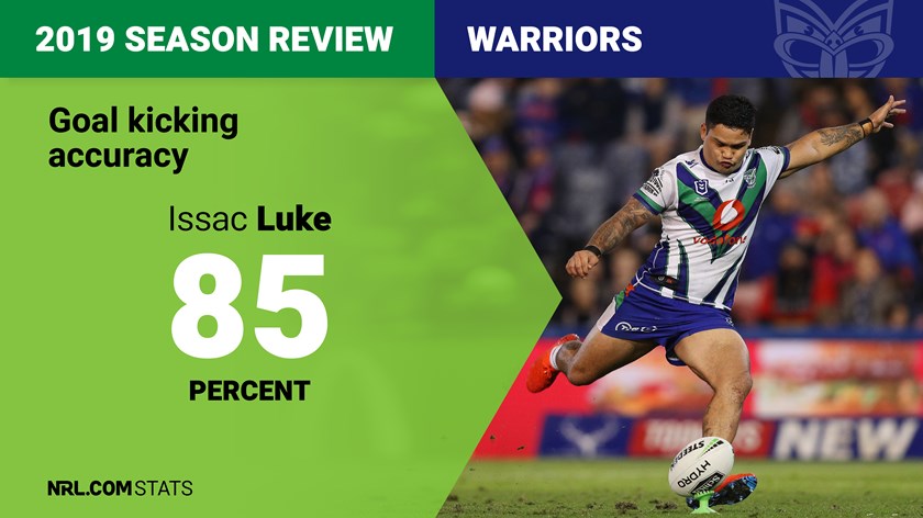 The Warriors had a few issues in 2019 that need improvement but work off the tee wasn't really one; their 81% success rate, predominantly via Adam Keighran, Chanel Harris-Tavita, Patrick Herbert and Issac Luke, was the fifth-best in the NRL. Keighran (90%) and Luke (85%) were among the NRL's best in their limited stints.