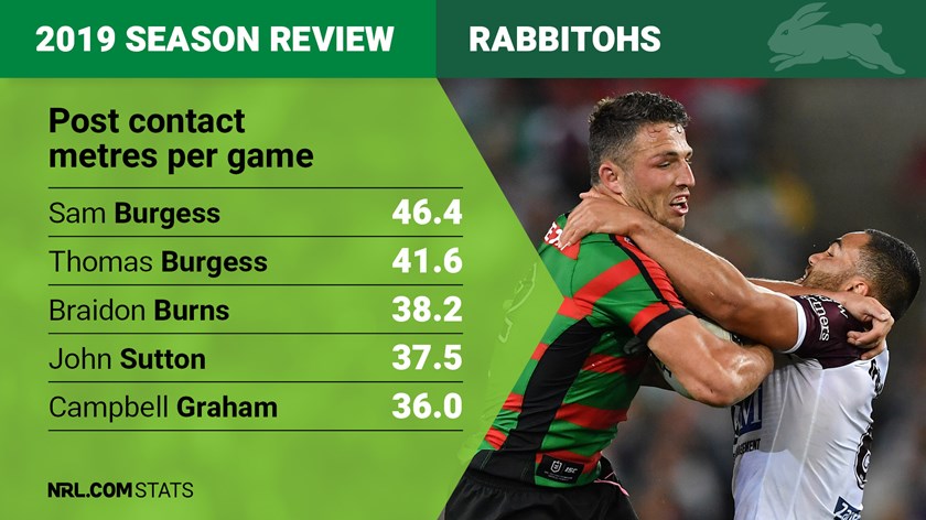 Sam Burgess led the way despite his shoulder woes, making 46 PCM per game ahead of his brother Tom (42) and Burns (38). Jaydn Su'A was the hardest to bring down on a per-carry basis, making 3.86 PCM per run ahead of Tavita Tatola (3.39) and Dean Britt (3.37).