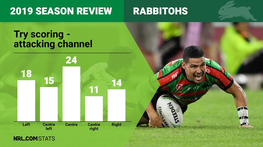 With the NRL's fourth-best defence, tries conceded wasn't a huge issue for the Bunnies in 2019. Their left wing was the leakiest channel with 19 tries in that area, with a further 15 on the right wing and 15 more through the middle.