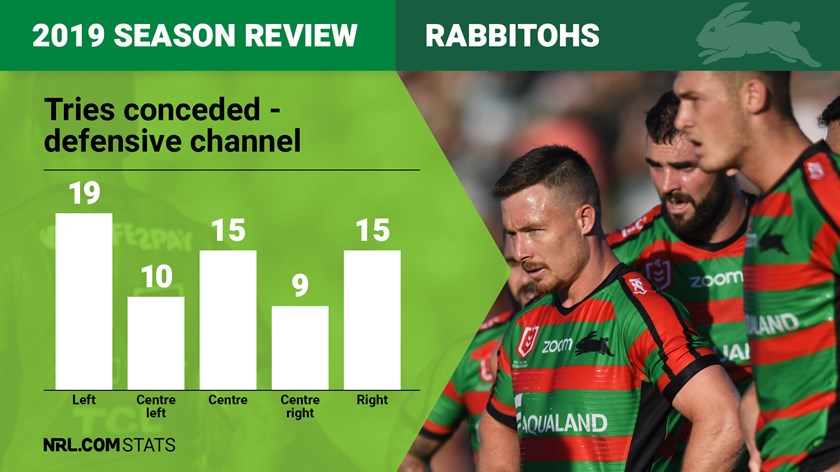 With the rotating roster of names forced to play out wide for Souths in 2019, a little defensive miscommunication would be expected but there was no defensive channel in which they weren't in the top half of the competition.