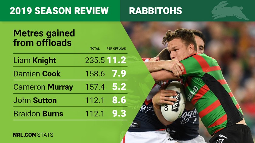 Offloads weren't a big part of the Rabbitohs' game plan in 2019, finishing last for offloads thrown. They were 12th for metres gained from offloads, suggesting they were a bit more effective with them than plenty of the other sides.