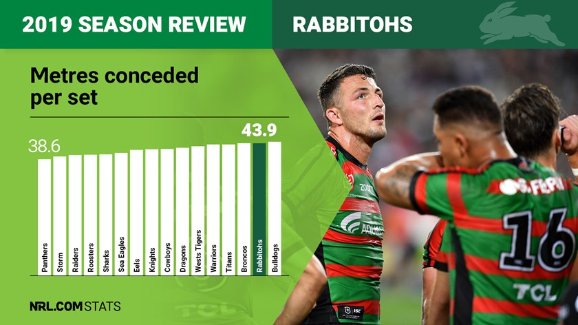 One glaring area of weakness for Wayne Bennett's troops in 2019 was allowing opponents to roll upfield too easily. Overall Souths conceded an average of 43.9 metres per set – only Canterbury (44.4m) conceded more ground per possession.