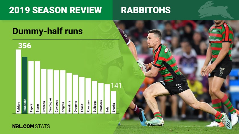 Perhaps surprisingly however the Rabbitohs finished last in the NRL for metres per run from dummy half at just 7.8 per run. The Dragons (9.7), Bulldogs (9.6) and Broncos (9.5) topped this metric.
