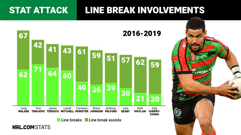 By tallying up the line break contributions (line breaks made plus line breaks assisted) for every player in the NRL over the past two regular seasons, Walker comes out well on top with 65 (31 breaks and 34 assists).