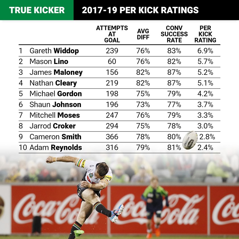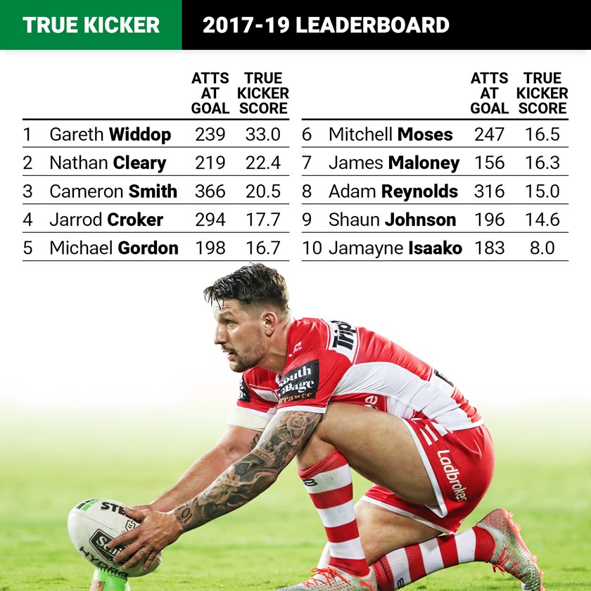 But if you factor in where each kick was taken over the past three years to come up with a True Kicker rating, it's former St George Illawarra captain Gareth Widdop who has been the NRL's sharpest shooter.