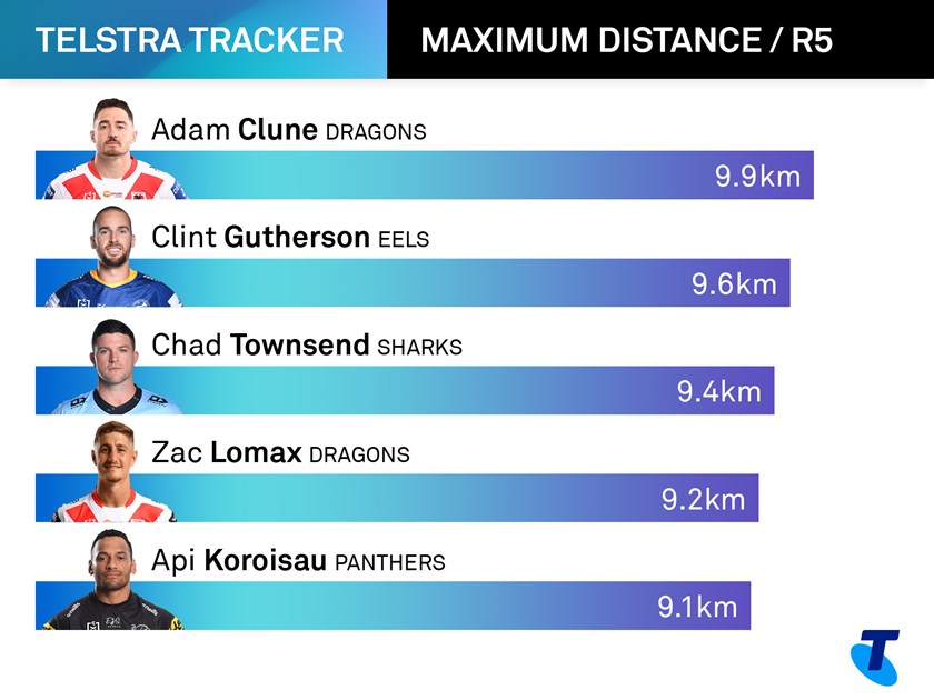 Gutherson also covered 9.6km against the Panthers - second for the round to Dragons rookie Adam Clune, who racked up 9.9km.