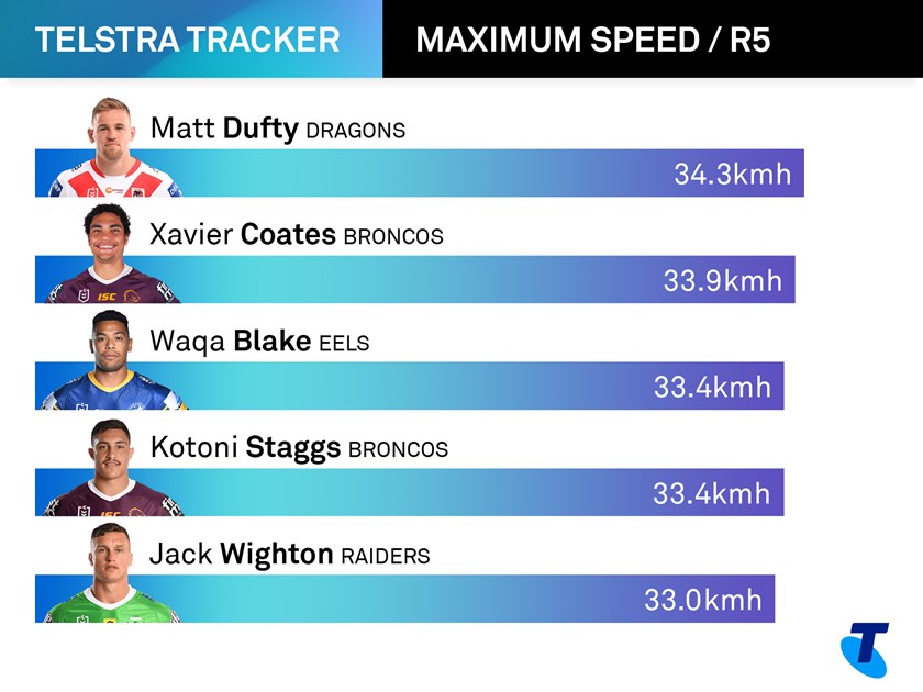 Broncos youngster Xavier Coates (33.9km/h), Eels centre Waqa Blake (33.4), Brisbane back Kotoni Staggs (33.4) and Raiders five-eighth Jack Wighton (33) also scorched the turf.
