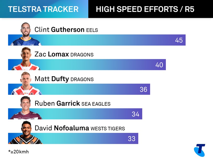 It was a big round for high-speed efforts - Dragons centre Zac Lomax posted 40, with his teammate Matt Dufty (36), Manly winger Reuben Garrick (34) and Wests Tigers flyer David Nofoaluma (33) filling out the top five.