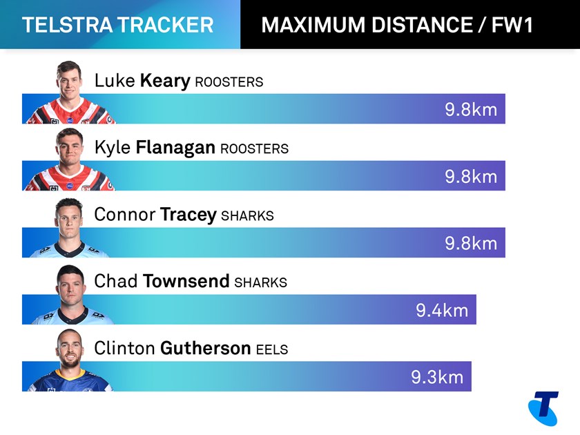 Elsewhere, Roosters halves Luke Keary and Kyle Flanagan and Sharks five-eighth Connor Tracey tied for the most distance covered on 9.8km.