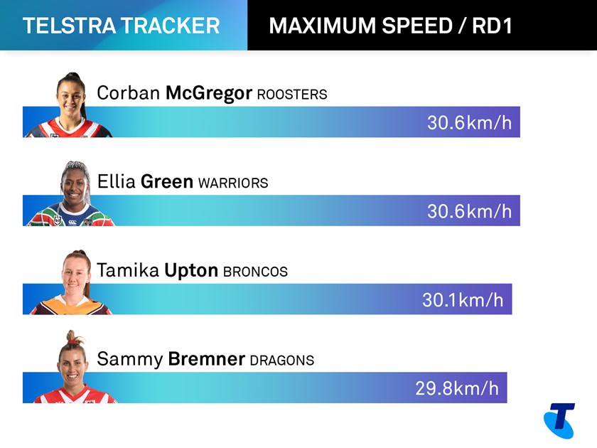 McGregor and Green both recorded game-high speeds of 30.6 km/h in round one of the NRL Telstra Women's Premiership – a record since Telstra Tracker was introduced to the women's game last year.