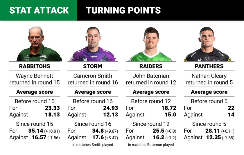 The Panthers are averaging six points more per match since star halfback Nathan Cleary returned from suspension in round five, which coincided with their only loss of the season to Parramatta.