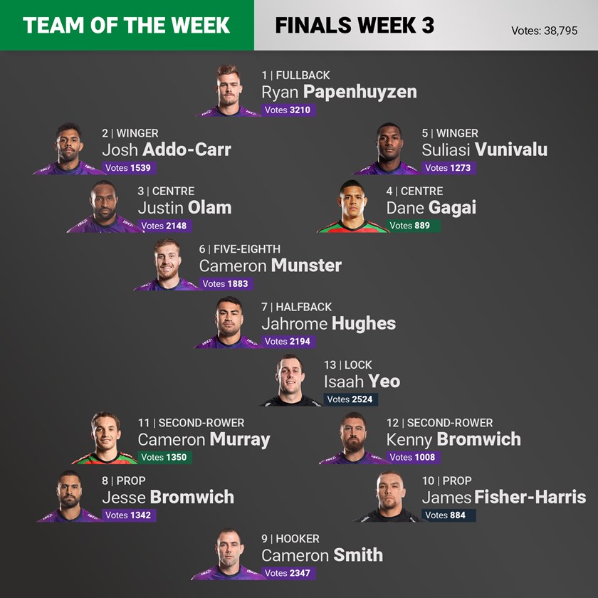 The purple reigned at Suncorp Stadium and doubled down in Team of the Week voting with Cameron Smith leading a gang of nine Storm players into the side chosen by fans after the two preliminary finals.