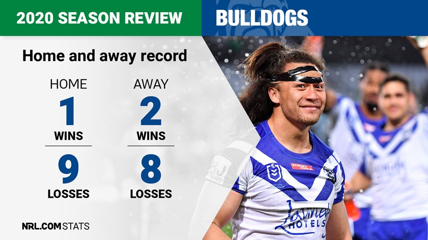 The Dogs finished up with the worst home record of any side, with just a solitary win from 10 home games. Their two wins from 10 away games bettered only the Broncos and equalled the Cowboys.